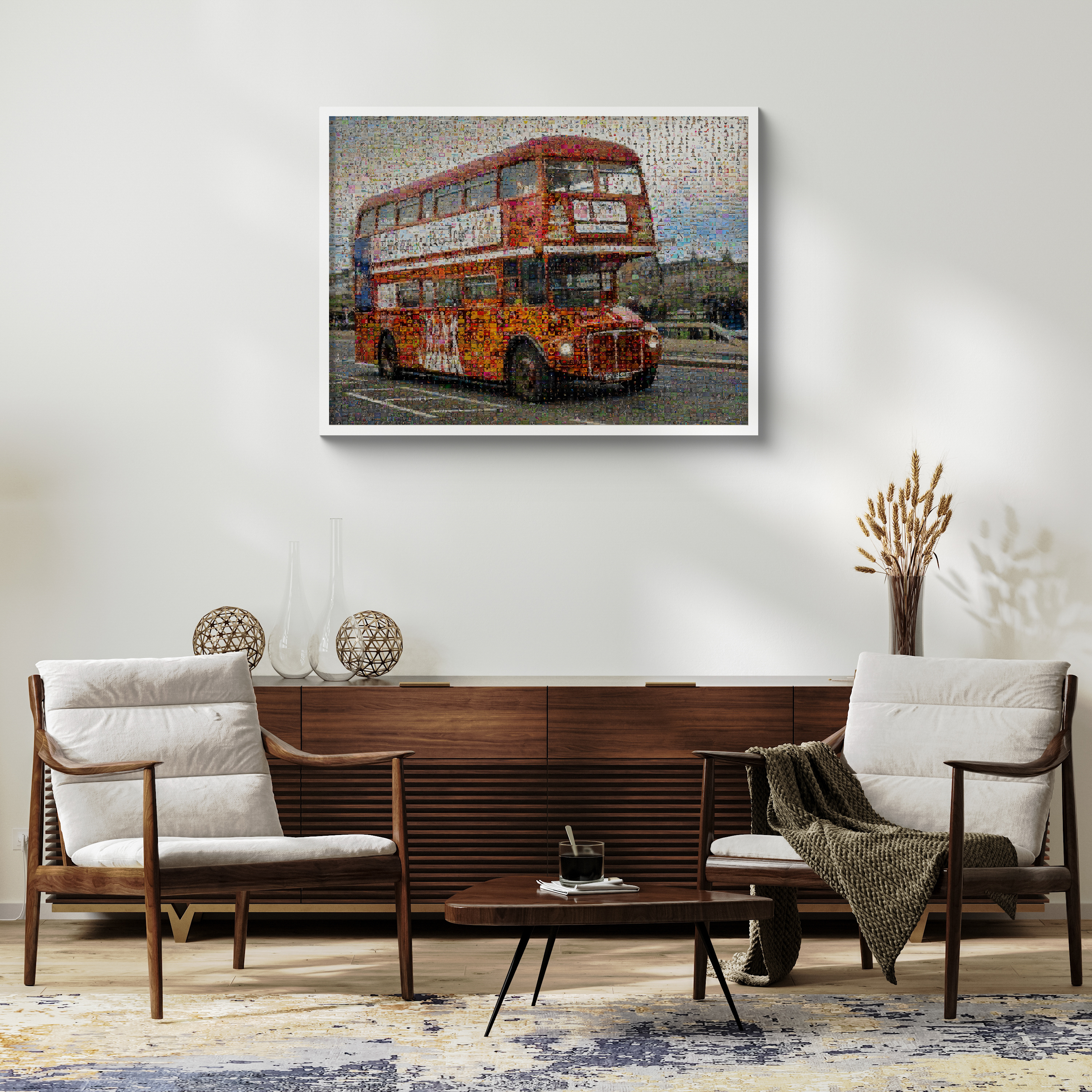Créez votre propre chef-d'œuvre personnalisé avec notre impression individuelle de mosaïque photo. Imaginez un bus rouge à impériale de Londres, composé de vos souvenirs de voyage inoubliables. Ce produit unique est parfait pour les amateurs de voyages, les familles et les amis qui souhaitent immortaliser leurs souvenirs communs. Offrez un cadeau surprenant ou embellissez votre maison.