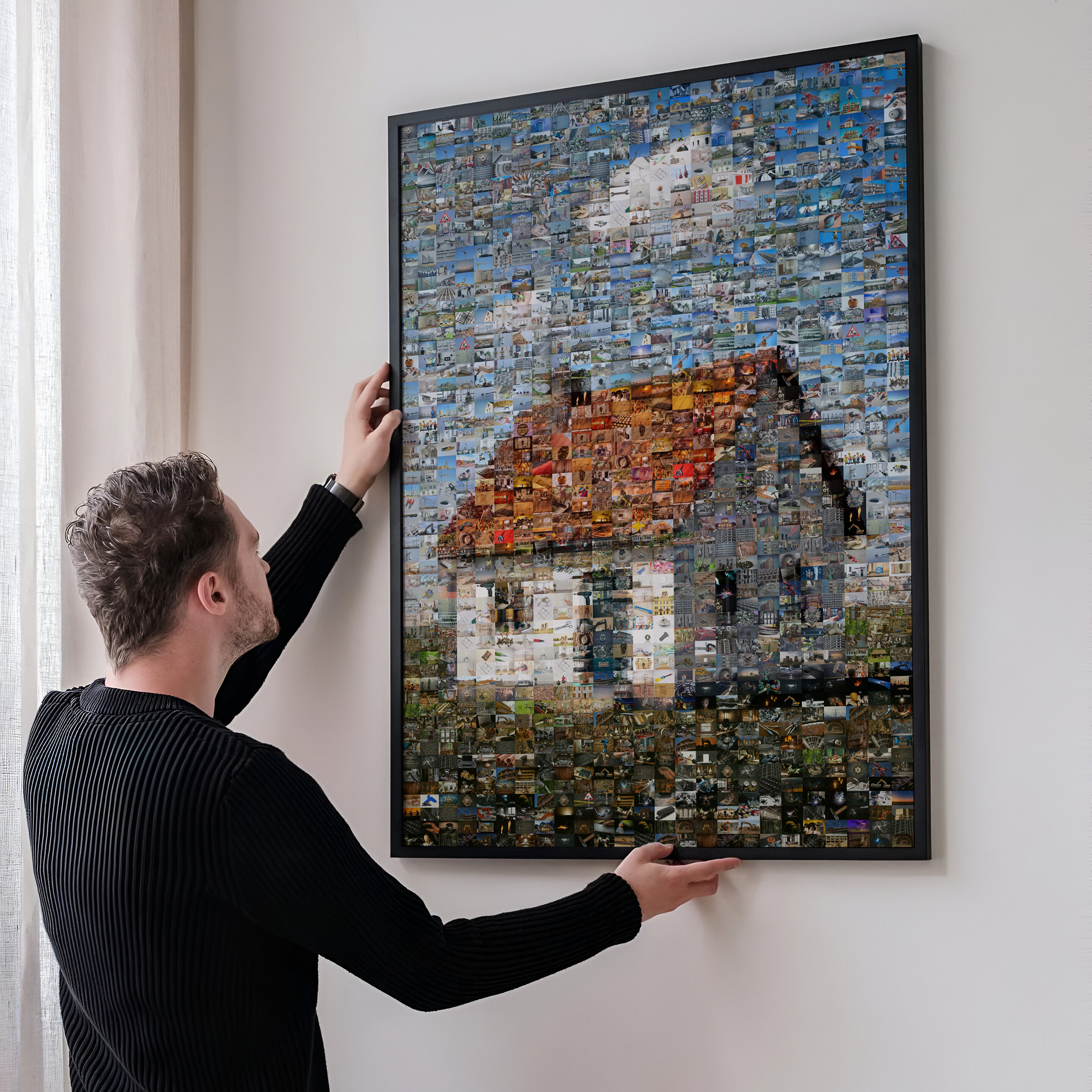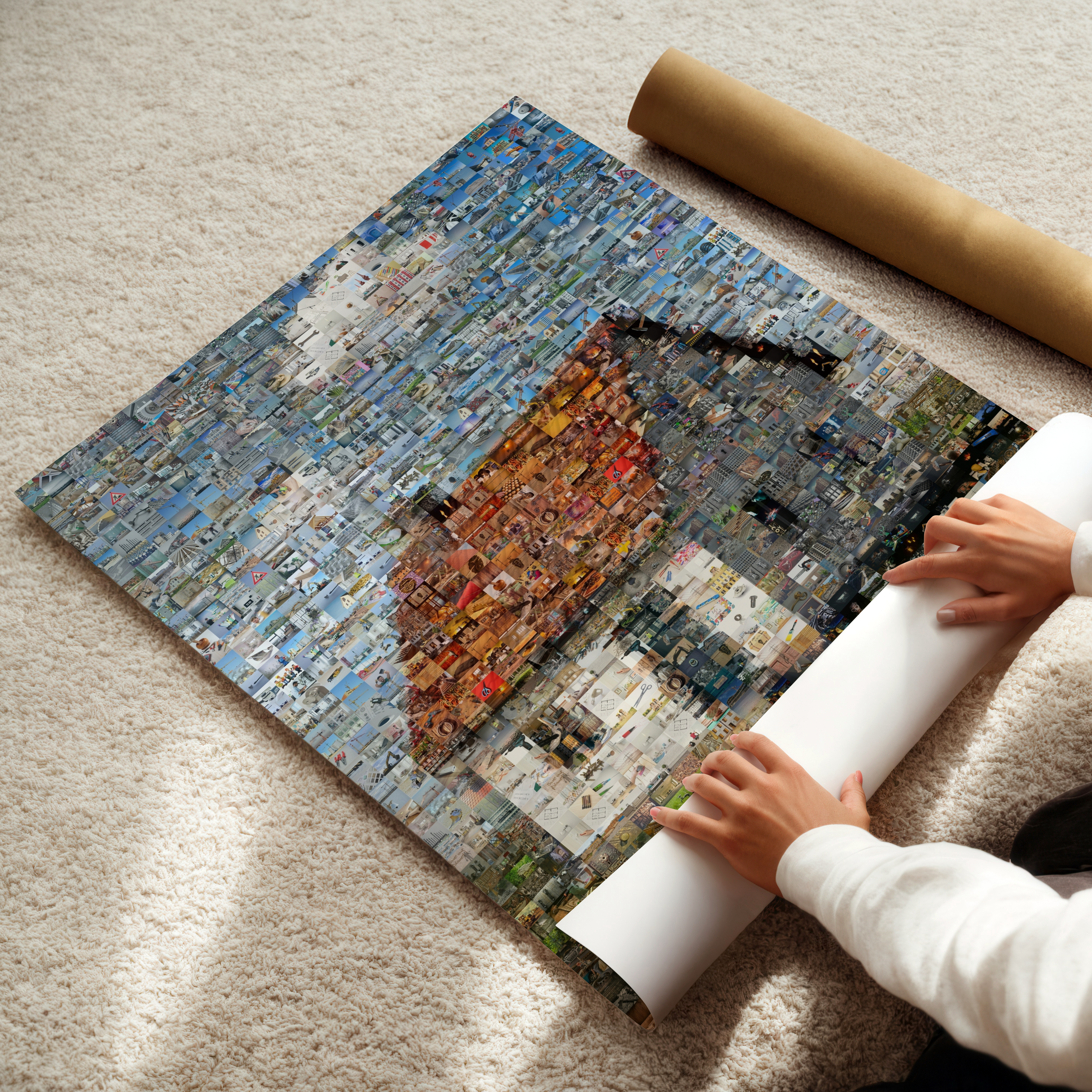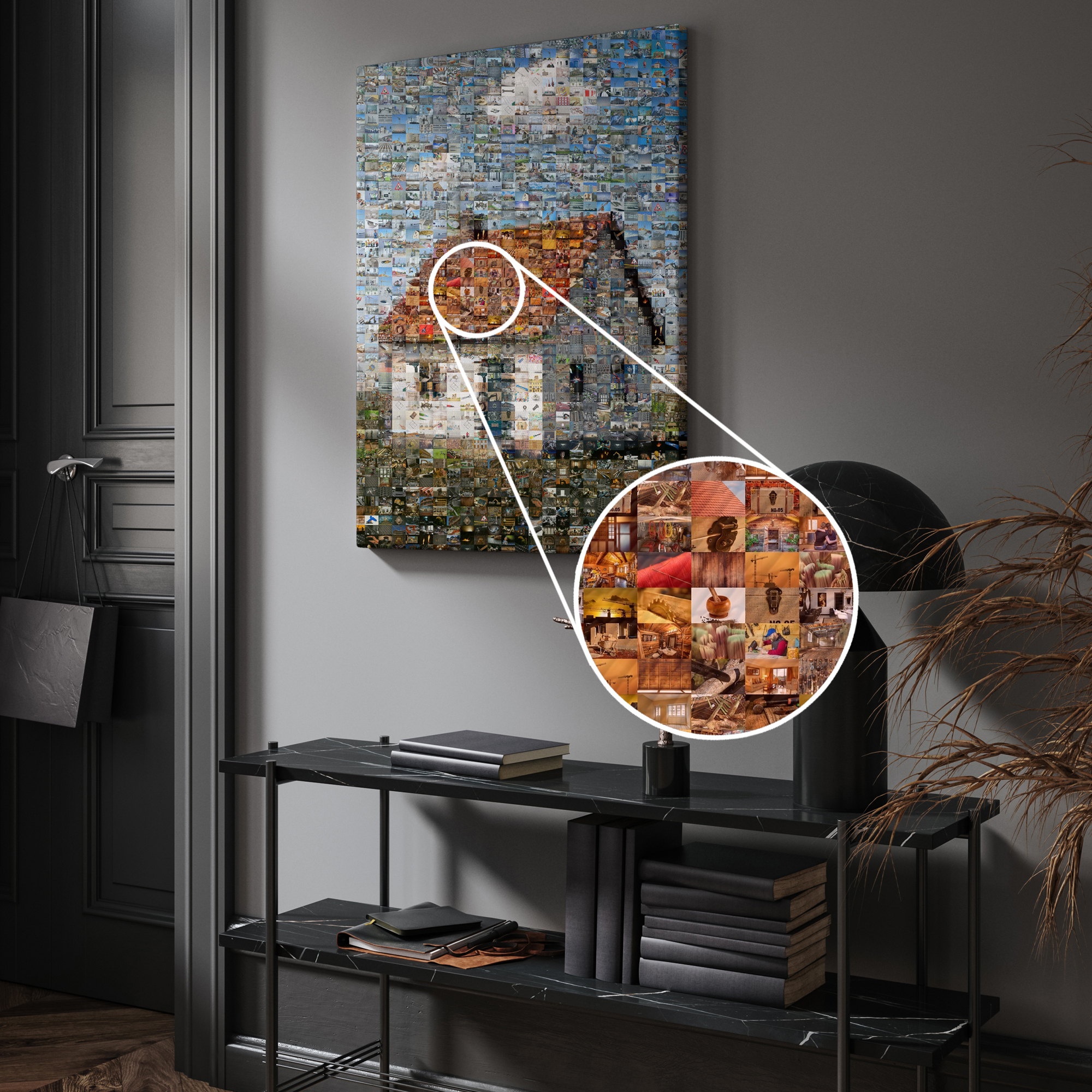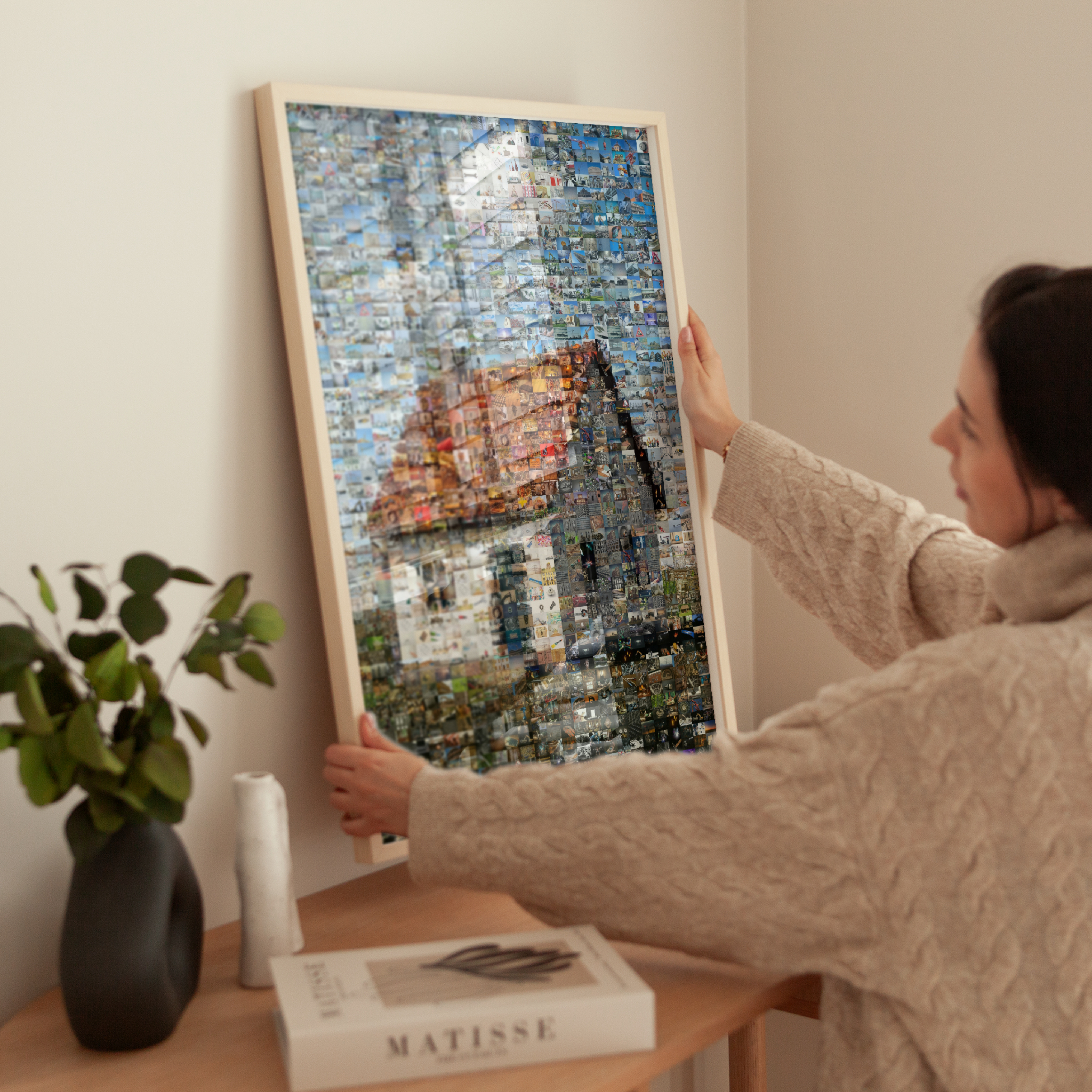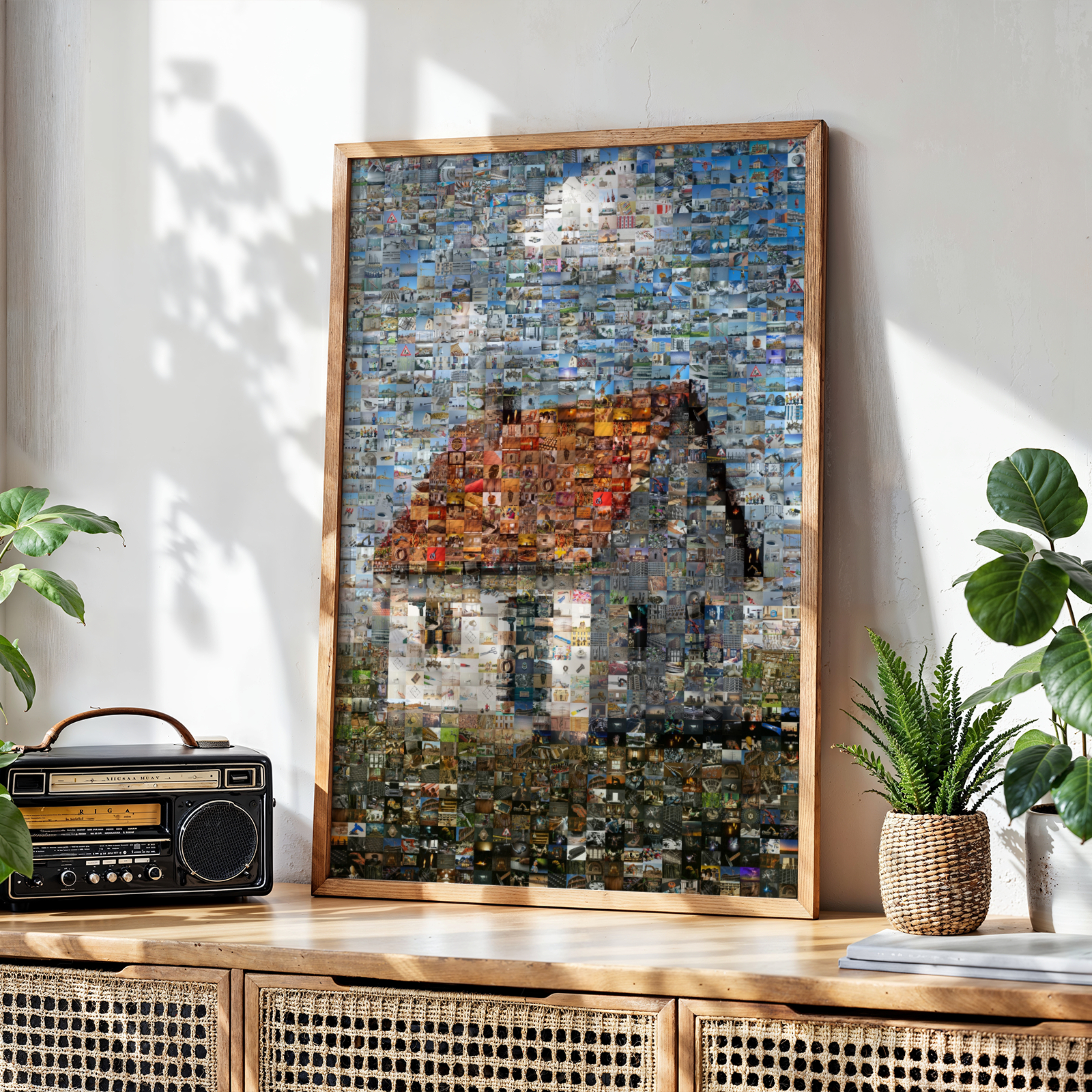 Personnalise ton rendu: mosaïque classique à carreaux réguliers, parquet mêlant formats portrait et paysage, chaos créatif, ou détail combinant petites et grandes vignettes. Ajuste taille de tuile, cadrage, teinte et densité. On génère plusieurs variantes optimisées: tu choisis celle qui te plaît.
